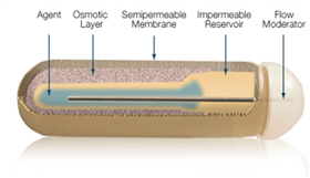 ALZET® Osmotic Pumps 是體積只有膠囊大小的滲透壓泵,符合 USP 醫(yī)療塑料膠材料生物相容性標準,可植入實驗動物皮下或腹腔內(nèi),直接或通過導(dǎo)管以 ul/小時的速度緩慢持續(xù)準確地送出測試藥劑。Alzet 緩釋泵由外到內(nèi)分為三層(如下圖所示),最外層是半透膜材料(Semipermeable Membrane),最內(nèi)層為不透水彈性材料制成的貯藥囊(Impermeable Reservoir),中間為高滲的鹽夾層(Osmotic Layer)。當(dāng)泵體被植入動物體內(nèi)時,由于滲透壓差迫使體液透過泵表面的半透膜流向高滲鹽夾層,擠壓貯藥囊,使藥物(Agent)按照預(yù)計速度經(jīng)導(dǎo)流管(Flow Moderator)釋放到動物體內(nèi)。