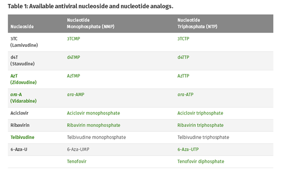 抗病毒核苷/核苷酸類似物可以通過抑制病毒復(fù)制的幾個關(guān)鍵過程來抑制病毒繁殖,它們通過與天然的dNTP/NTP競爭結(jié)合到新的病毒核酸中,從而導(dǎo)致鏈終止或者誘變。在細(xì)胞培養(yǎng)實(shí)驗(yàn)中,可以用抗病毒核苷酸的非磷酸化核苷變體,這種核苷酸在細(xì)胞內(nèi)被多種病毒和/或宿主激酶激活,從而發(fā)揮(tri)磷酸化形式的抗病毒作用。
