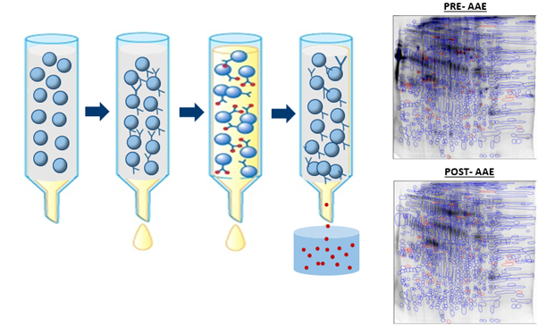 2014年,作為過程污染物殘留檢測產(chǎn)品領(lǐng)先開發(fā)商,Cygnus結(jié)合多年HCP抗體及試劑盒開發(fā)經(jīng)驗(yàn),推出了Affinity Antibody Extraction(AAE)方法驗(yàn)證覆蓋率,突破了傳統(tǒng)2DWB方法驗(yàn)證覆蓋率的局限性,更真實(shí)準(zhǔn)確反應(yīng)HCP抗體覆蓋率。AAE提取富集的樣品和未經(jīng)AAE提取的樣品分別經(jīng)過2D PAGE分離后使用銀染的方法對(duì)得到的點(diǎn)進(jìn)行匹配、計(jì)數(shù)、計(jì)算覆蓋率。這種方法一經(jīng)上市后,廣泛得到生物制藥企業(yè)和監(jiān)控部門的認(rèn)可。