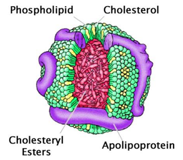 脂蛋白由脂質(zhì)和蛋白質(zhì)以非共價(jià)作用結(jié)合而組成,其外層是磷脂(phospholipids)、未酯化的膽固醇(cholesterol)和蛋白質(zhì),核心是中性脂質(zhì),包括膽固醇酯(cholesteryl esters)和三?;视?TAG)。載脂蛋白(Apolipoprotein)是一種蛋白質(zhì),它與其他親水脂性分子一起圍繞在脂質(zhì)周?chē)?/span>共同構(gòu)成脂蛋白。這種結(jié)構(gòu)讓脂蛋白能夠通過(guò)水基循環(huán),特別是血液和淋巴循環(huán)進(jìn)行體內(nèi)運(yùn)輸。