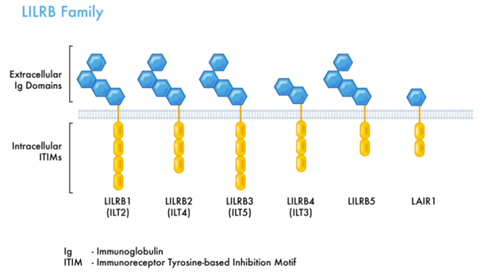 ? ? ? 白細(xì)胞免疫球蛋白樣受體 (The leukocyte immunoglobulin-like receptors, LILRs)?由抑制性LILR亞家族B(LILRB1-5)和激活性LILR亞家族A(LILRA1-6)組成。LILRB家族受體屬于I型跨膜糖蛋白,胞外區(qū)含有Ig樣結(jié)構(gòu)域,胞內(nèi)區(qū)含有免疫受體酪氨酸抑制基序(ITIM)結(jié)構(gòu)域,是免疫抑制性受體。LILRBs(LILRB1-5)主要在髓系細(xì)胞表達(dá),同時(shí)在腫瘤干細(xì)胞上也高表達(dá),并可能直接調(diào)控癌癥的發(fā)生和復(fù)發(fā)以及腫瘤干細(xì)胞的活性。LILRBs能抑制腫瘤免疫活性,并支持癌細(xì)胞在多種癌癥中存活,促進(jìn)腫瘤生長(zhǎng)和轉(zhuǎn)移。