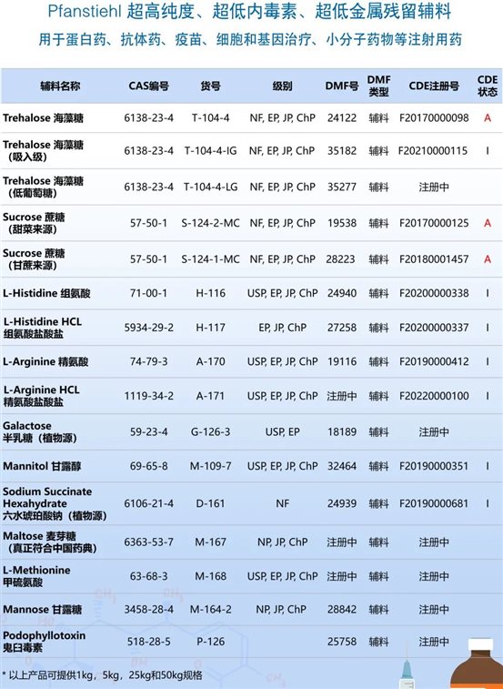 本次論壇西美杰將重點展出Pfanstiehl將高純度低內毒素注射用糖類及氨基酸等十余種輔料產(chǎn)品。
