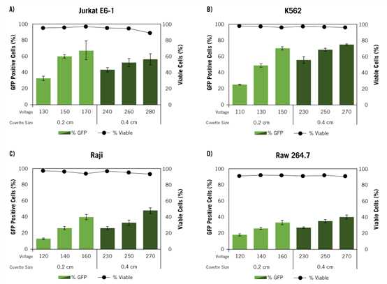 Jurkat E6-1 (A)、K562 (B)、Raji (C)和Raw 264.7 (D)細(xì)胞在不同電壓條件下使用Ingenio®電轉(zhuǎn)緩沖液和Ingenio®EZporator®電轉(zhuǎn)儀,分別用0.2cm和0.4cm電轉(zhuǎn)杯和EGFP報(bào)告基因觀察電轉(zhuǎn)效率。電穿孔后48h,用流式細(xì)胞術(shù)測(cè)定GFP陽(yáng)性細(xì)胞百分比(柱狀圖)和細(xì)胞活率(點(diǎn)線圖)。