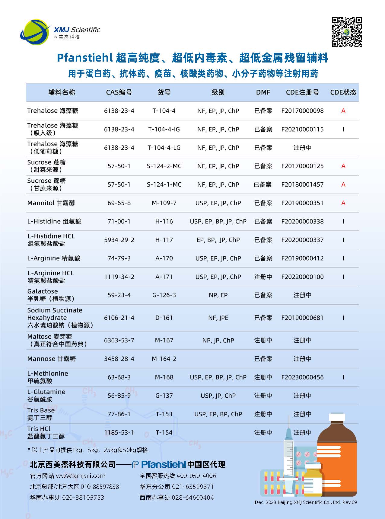 Pfanstiehl Inc.成立于1919年, 公司總部位于美國(guó)芝加哥市北郊沃吉根工業(yè)區(qū),是美國(guó)老字號(hào)企業(yè)之一,也是一家真正的cGMP生產(chǎn)商。作為一家有著百年基業(yè)和沉淀的公司,Pfanstiehl Inc立志將產(chǎn)品質(zhì)量做到極致,是全球生物制藥領(lǐng)域超純糖類、氨基酸類以及其他尖端分子的領(lǐng)先生產(chǎn)商,迄今已服務(wù)全球蛋白藥、抗體藥、疫苗、mRNA及核酸類藥物等領(lǐng)域100年以上。Pfanstiehl Inc. 超高純度、超低內(nèi)毒素,超低金屬離子含量的輔料制劑產(chǎn)品,全面的技術(shù)和法規(guī)審計(jì)支持,真正的cGMP質(zhì)量控制體系,接受FDA的定期監(jiān)察審計(jì)等都被國(guó)際知名生物制藥公司所認(rèn)可。Pfanstiehl Inc.是全球超高純度、超低內(nèi)毒素、超低金屬離子含量等注射級(jí)糖類的領(lǐng)先制造商,產(chǎn)品生產(chǎn)均參照ICHQ7質(zhì)量體系。自2015年進(jìn)入中國(guó)市場(chǎng)以來(lái),Pfanstiehl Inc.已獲得13個(gè) CDE登記號(hào),主要產(chǎn)品含括海藻糖,蔗糖,D-甘露醇,組氨酸,組氨酸鹽酸,精氨酸,精氨酸鹽酸,琥珀酸鈉,甲硫氨酸等,其中海藻糖F20170000098,甘蔗源蔗糖F20180001457和甜菜源蔗糖F20170000125, D-甘露醇F20190000351的CDE號(hào)均已激活。 Pfanstiehl Inc.于2023年又重磅推出注射級(jí)Tris和Tris HCl,這將是全球高質(zhì)量的Tris和Tris HCl。作為一家有著百年歷史的企業(yè),Pfanstiehl Inc. 也在持續(xù)投資,不斷擴(kuò)充產(chǎn)品管線和擴(kuò)大生產(chǎn)產(chǎn)能,以滿足和支持全球生物制藥行業(yè)的快速發(fā)展,特別是更好的助力中國(guó)生物制藥的發(fā)展需求。