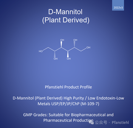 Pfanstiehl品牌D-甘露醇,秉承一貫高品質(zhì)理念,按照ICHQ7質(zhì)量體系生 產(chǎn),具有高純度,超低內(nèi)毒素,超低微生物含量的特點(diǎn),并單獨(dú)檢測(cè)29種金屬離子含量(ppb水平),符合多國(guó)藥典,滿足生物制藥和疫苗對(duì)于注射級(jí)別甘露醇的生產(chǎn)要求。