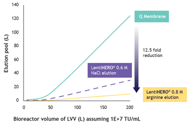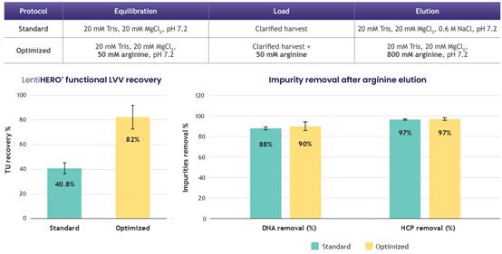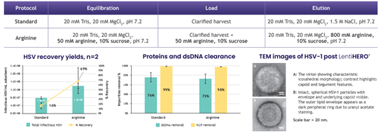 用0.8M精氨酸洗脫,HSV回收率可達(dá)到69%,LentiHERO®載量可達(dá)1.4E+8 IU/ml,同時實(shí)現(xiàn)高效的雜質(zhì)去除。