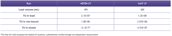 篩選裝置上樣量20ml,測得填料載量為3E+8 IU/ml。